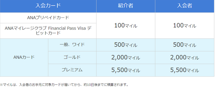 紹介者も入会者も、入会者が申し込んだカードの種類に応じて、同じだけマイルが貰えます。