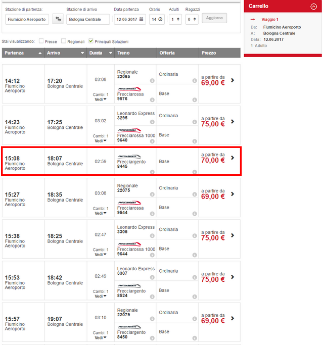 スーツケースを引きずって列車の乗り換えは出来るだけ避けたいので、1日1本しかない、15:08 フィウミチーノ空港~ボローニャ中央駅まで直行のフレッチャジェントをTrenitaliaのWEBで予約しました。